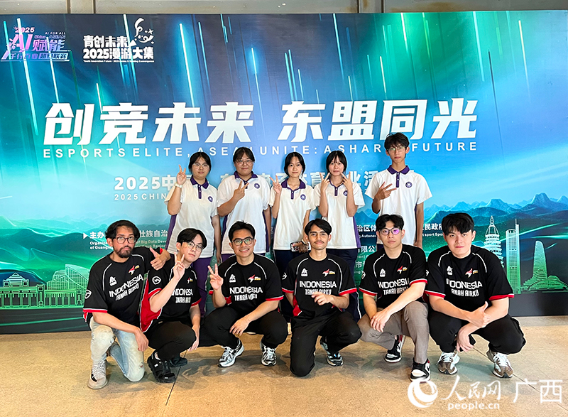 Teams pose for photos at the 2025 China-ASEAN E-sports Competition in Nanning, south China's Guangxi Zhuang Autonomous Region. (People's Daily Online/Wei Huan)