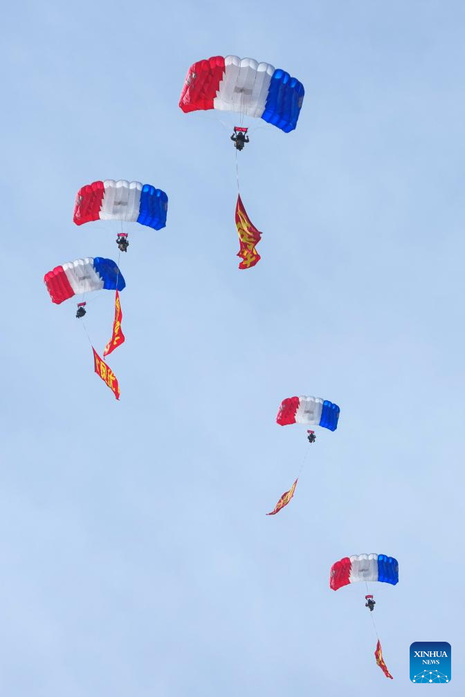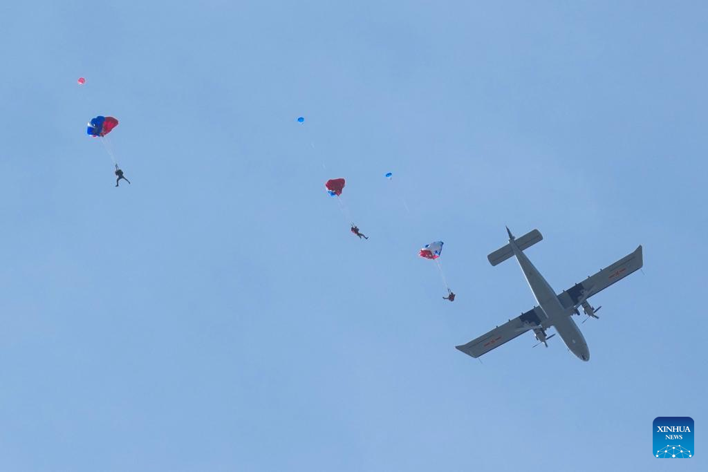 Members of the Bayi Parachute Team of the Chinese People's Liberation Army Air Force perform during the 2025 aviation open-day activities of the Chinese People's Liberation Army Air Force and Changchun Air Show in Changchun, northeast China's Jilin Province, Sept. 19, 2025. The events kicked off here on Friday. (Xinhua/Yan Linyun)