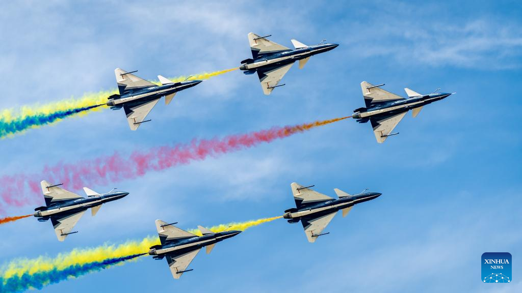 Aircraft of the Bayi Aerobatic Team of the Chinese People's Liberation Army Air Force perform during the 2025 aviation open-day activities of the Chinese People's Liberation Army Air Force and Changchun Air Show in Changchun, northeast China's Jilin Province, Sept. 19, 2025. The events kicked off here on Friday. (Xinhua/Yan Linyun)