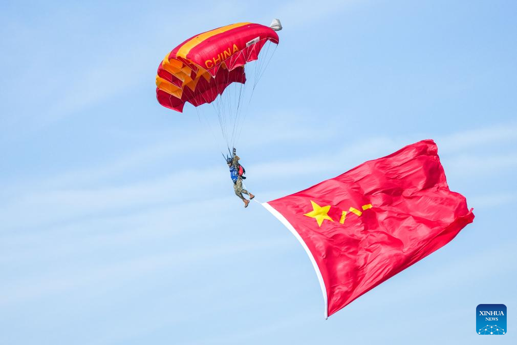 A member of the Bayi Parachute Team of the Chinese People's Liberation Army Air Force performs during the 2025 aviation open-day activities of the Chinese People's Liberation Army Air Force and Changchun Air Show in Changchun, northeast China's Jilin Province, Sept. 19, 2025. The events kicked off here on Friday. (Xinhua/Yan Linyun)