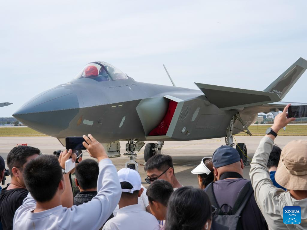 People view a J-20 fighter jet during the 2025 aviation open-day activities of the Chinese People's Liberation Army Air Force and Changchun Air Show in Changchun, northeast China's Jilin Province, Sept. 19, 2025. The events kicked off here on Friday. (Xinhua/Zhang Nan)