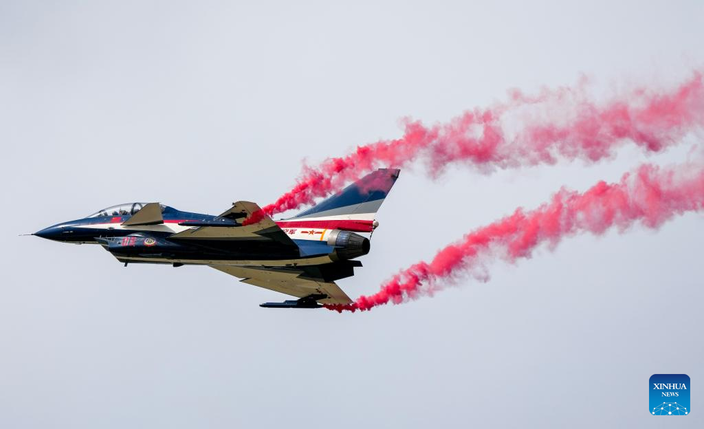 An aircraft of the Bayi Aerobatic Team of the Chinese People's Liberation Army Air Force performs during the 2025 aviation open-day activities of the Chinese People's Liberation Army Air Force and Changchun Air Show in Changchun, northeast China's Jilin Province, Sept. 19, 2025. The events kicked off here on Friday. (Xinhua/Yan Linyun)