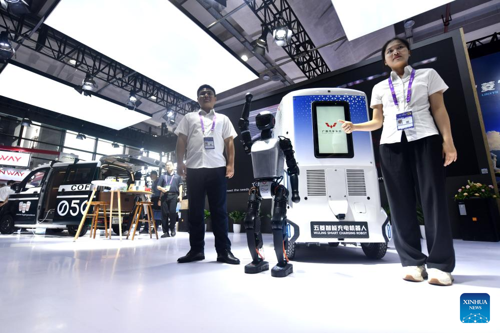 An intelligent charging robot is seen at the Nanning International Convention and Exhibition Center in Nanning, capital of south China's Guangxi Zhuang Autonomous Region, Sept. 19, 2025. Products involving cutting-edge technologies such as artificial intelligence, low-altitude economy and humanoid robots are showcased during the ongoing 22nd China-ASEAN Expo.