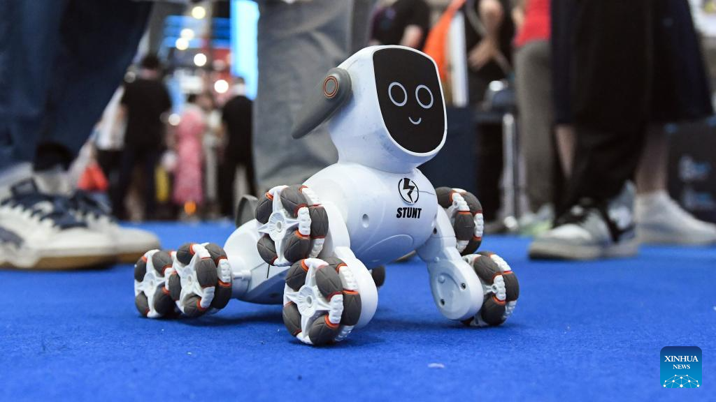 A robot dog interacts with a visitor at the Nanning International Convention and Exhibition Center in Nanning, capital of south China's Guangxi Zhuang Autonomous Region, Sept. 19, 2025. Products involving cutting-edge technologies such as artificial intelligence, low-altitude economy and humanoid robots are showcased during the ongoing 22nd China-ASEAN Expo.