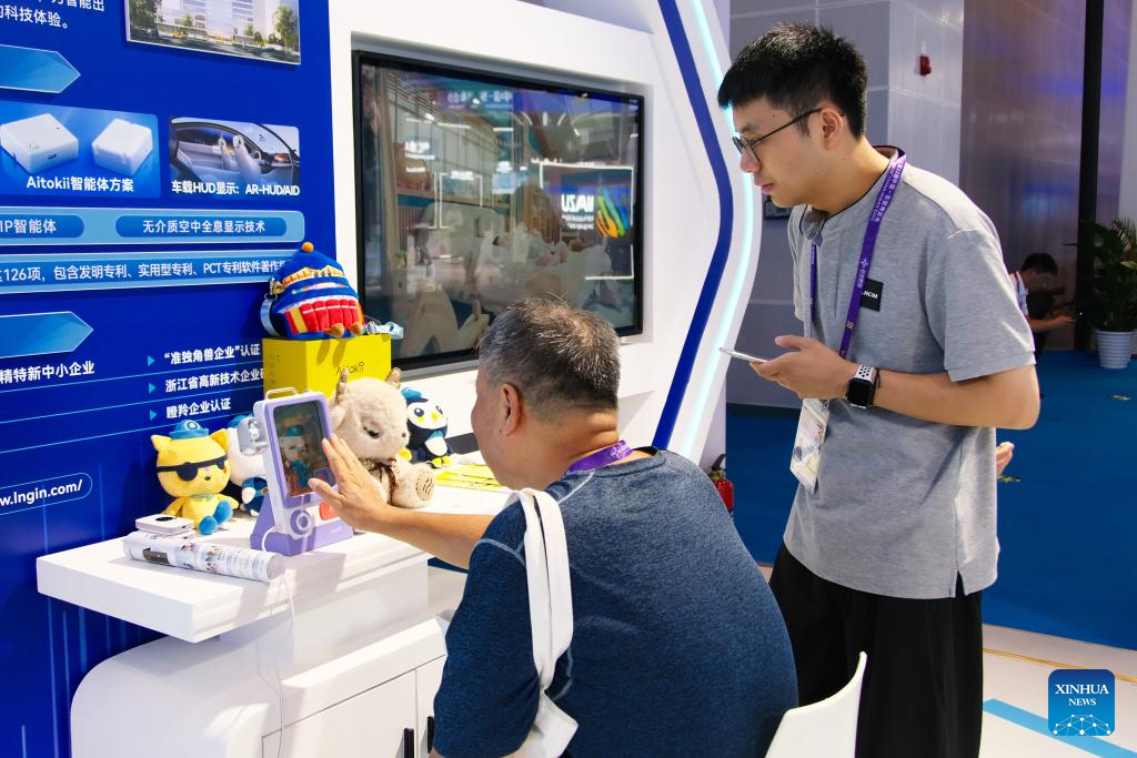 Visitors experience a naked-eye 3D AI children's companion robot at the Nanning International Convention and Exhibition Center in Nanning, capital of south China's Guangxi Zhuang Autonomous Region, Sept. 19, 2025. Products involving cutting-edge technologies such as artificial intelligence, low-altitude economy and humanoid robots are showcased during the ongoing 22nd China-ASEAN Expo.