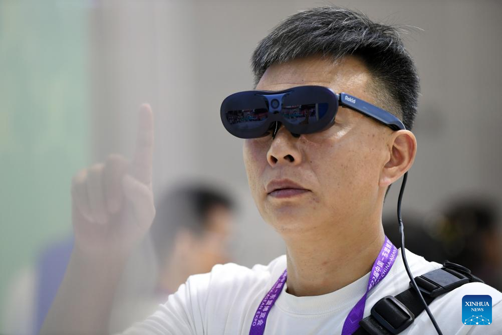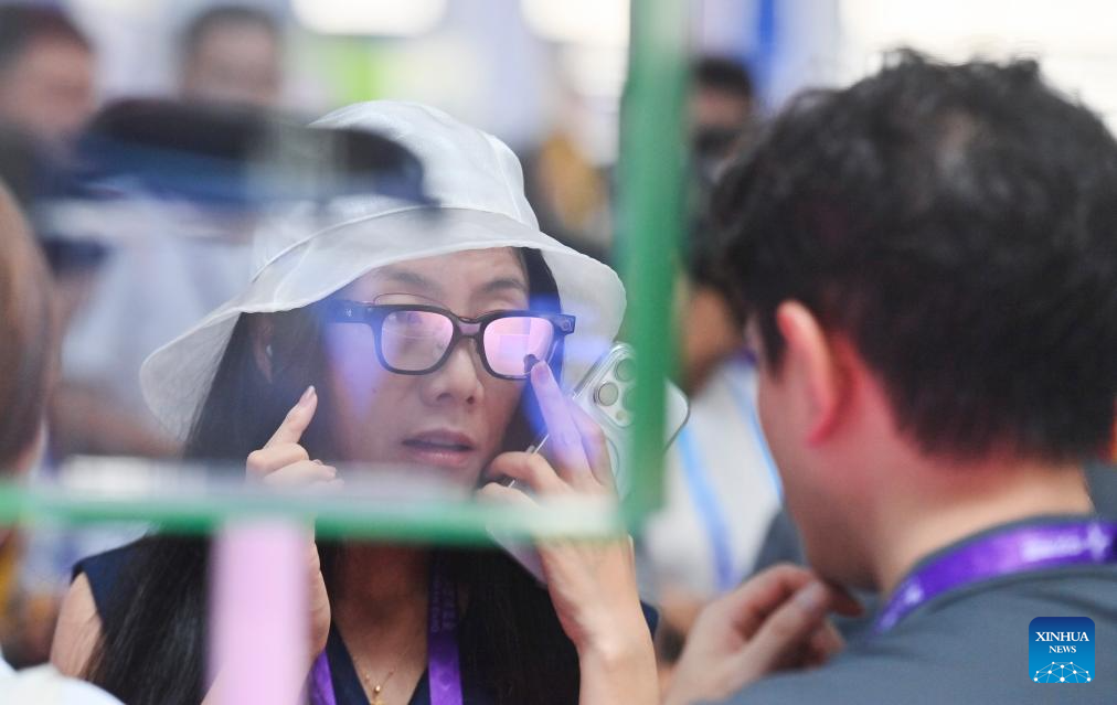A visitor tries a pair of AR glasses at the Nanning International Convention and Exhibition Center in Nanning, capital of south China's Guangxi Zhuang Autonomous Region, Sept. 18, 2025. Products involving cutting-edge technologies such as artificial intelligence, low-altitude economy and humanoid robots are showcased during the ongoing 22nd China-ASEAN Expo.