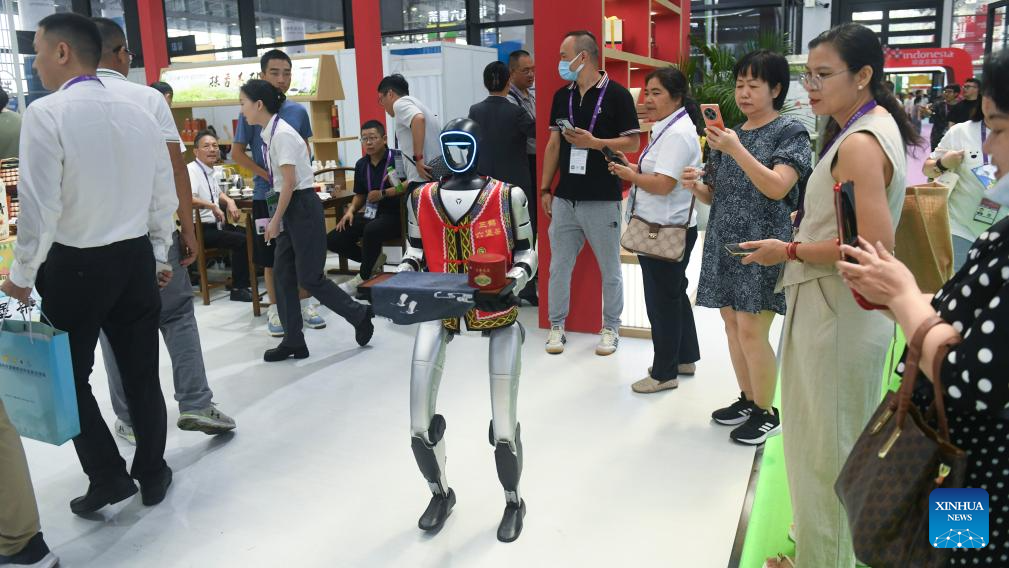 An humanoid robot serves tea at the Nanning International Convention and Exhibition Center in Nanning, capital of south China's Guangxi Zhuang Autonomous Region, Sept. 19, 2025. Products involving cutting-edge technologies such as artificial intelligence, low-altitude economy and humanoid robots are showcased during the ongoing 22nd China-ASEAN Expo.