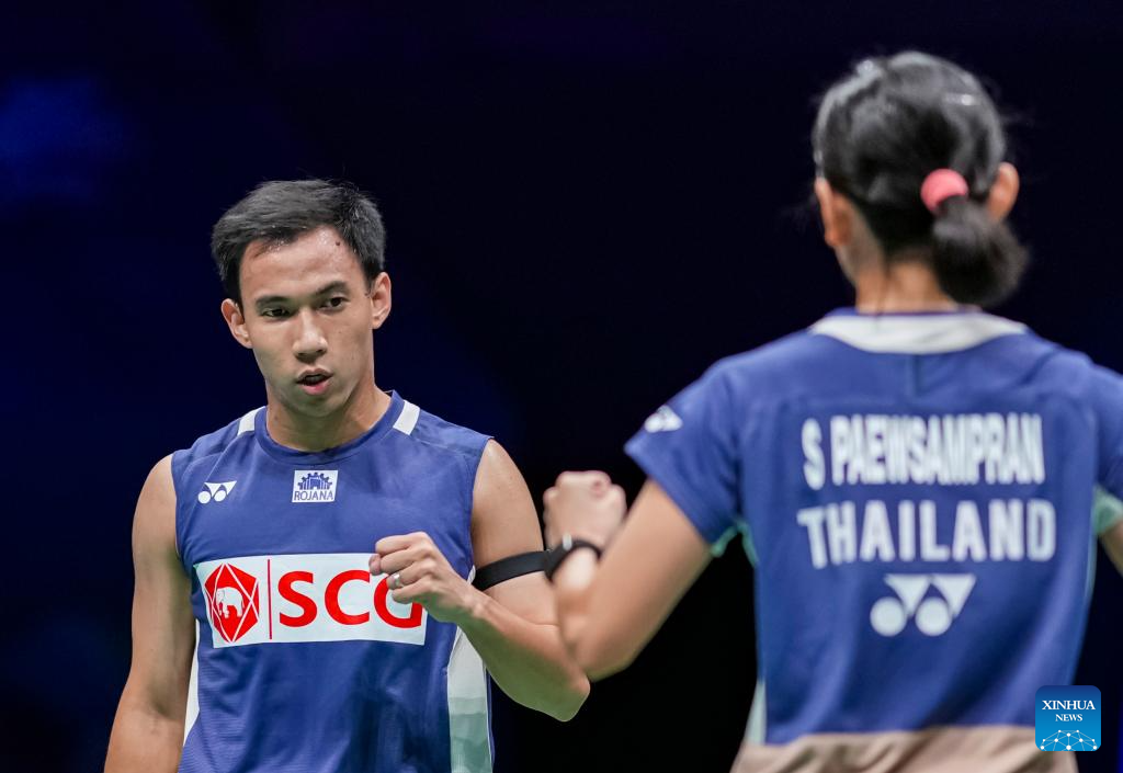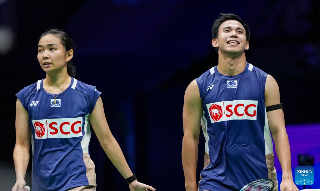 Dechapol Puavaranukroh (R)/Supissara Paewsampran of Thailand celebrate after winning the mixed doubles semifinal match against Jiang Zhenbang/Wei Yaxin of China at the China Masters 2025 in Shenzhen, south China's Guangdong Province, Sept. 20, 2025. (Xinhua/Sun Fei)