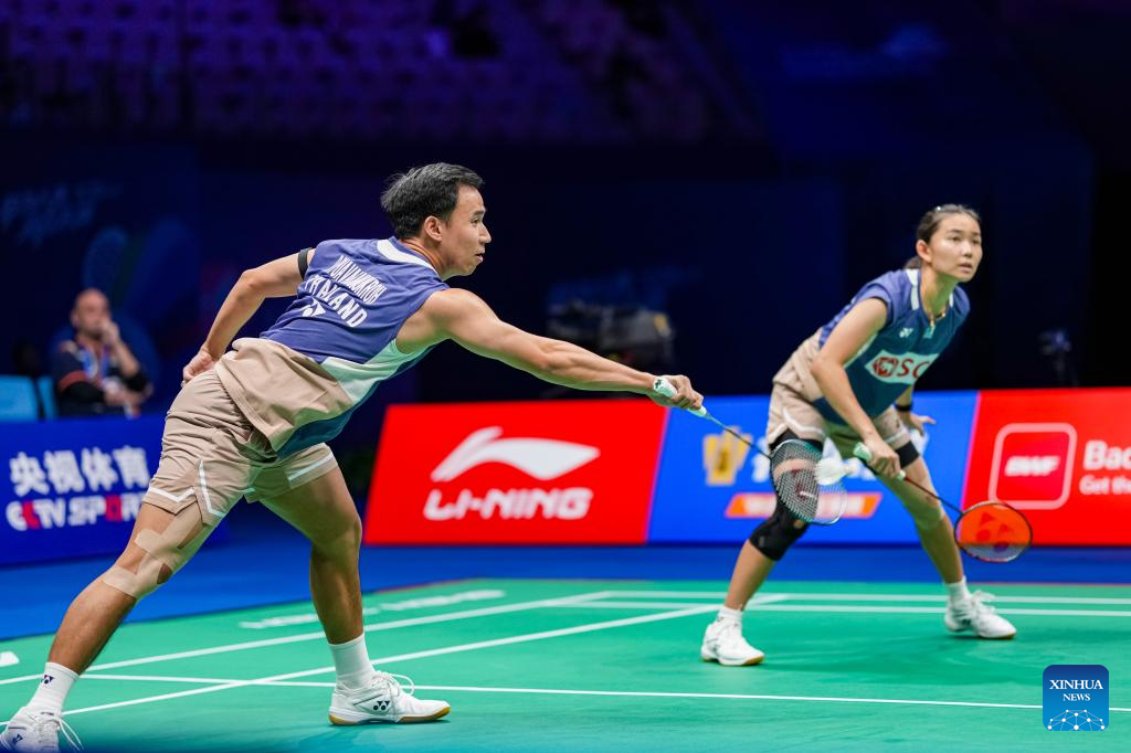 Dechapol Puavaranukroh (L)/Supissara Paewsampran of Thailand compete during the mixed doubles semifinal match against Jiang Zhenbang/Wei Yaxin of China at the China Masters 2025 in Shenzhen, south China's Guangdong Province, Sept. 20, 2025. (Xinhua/Sun Fei)