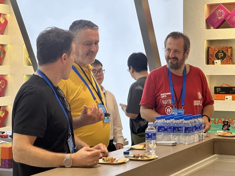 From left: Marko Nedeljkovi , a board member of the Journalists' Association of Serbia; Branko Zujovic, a foreign policy journalist with Pe at Weekly in Serbia; and Faruk Boric, executive director of the center for the Promotion and Development of Belt and Road Initiative in Bosnia and Herzegovina; taste Xuanwei ham in Xuanwei, Yunnan Province, on September 20, 2025.