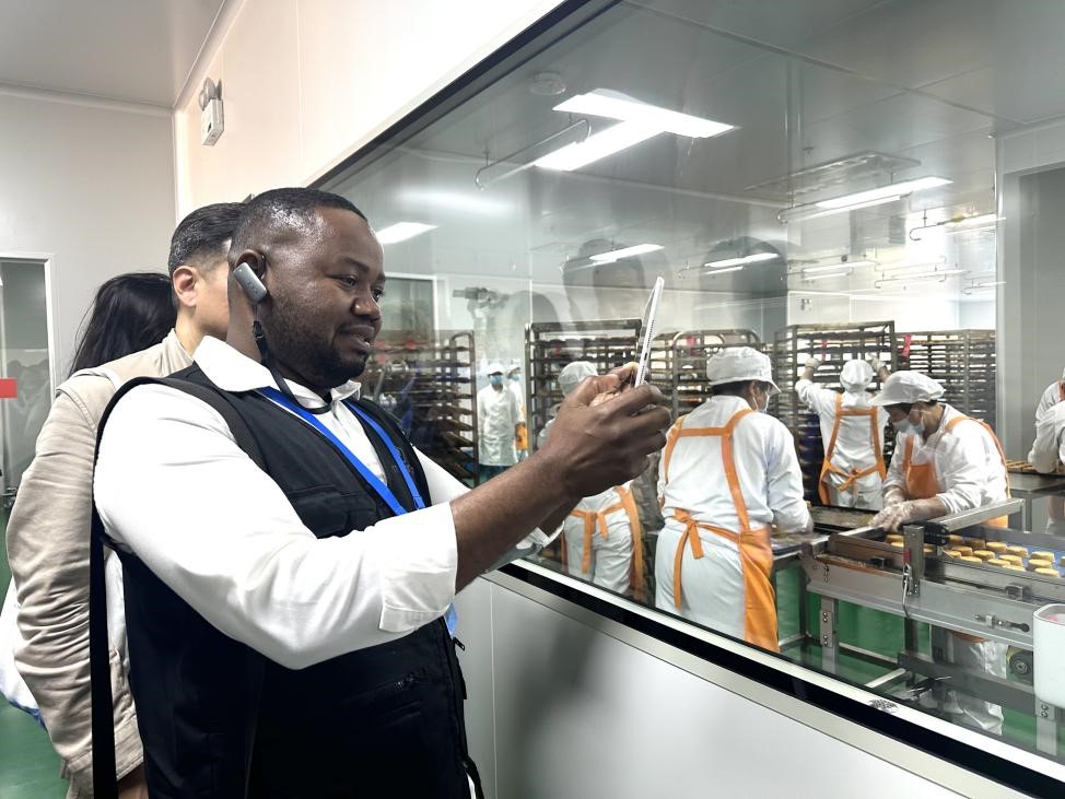 Milton Mana a, economic editor, Jornal OPAíS, Angola, visits a ham factory in Xuanwei, Yunnan Province, on September 20, 2025.