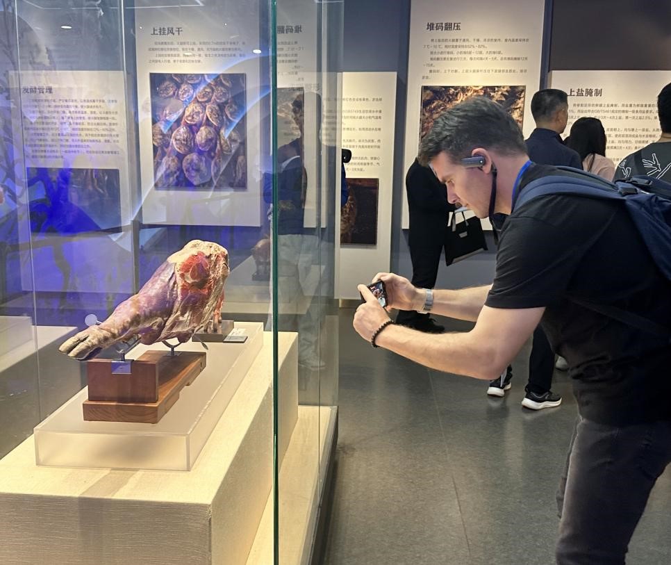Marko Nedeljkovi , a board member of the Journalists' Association of Serbia, visits the Xuanwei Ham Exhibition Hall in Xuanwei, Yunnan Province, on September 20, 2025. Yunnan's Xuanwei ham, known for its rich flavor and aroma, is driving local growth. The ham-making technique of Xuanwei was listed as a national intangible cultural heritage in 2011. On September 20, 2025, foreign journalists experienced its unique taste and impact firsthand. (Photos: People's Daily/Lin Zihan)