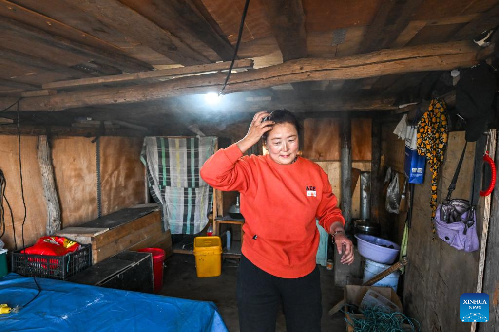 The wife of Duurengbulag prepares a meal at the summer pasture in Baori Hushu Gacha of Gerquluu Sumu, Jarud Banner of Tongliao, north China's Inner Mongolia Autonomous Region, Sept. 19, 2025. Every September, herders in Baori Hushu Gacha of Gerquluu Sumu in Jarud Banner drive their well-fed livestock from the summer pastures back to the winter pasture. (Xinhua/Lian Zhen)