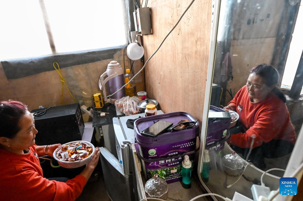 The wife of Duurengbulag puts food into a fridge before their departure the next day at the summer pasture in Baori Hushu Gacha of Gerquluu Sumu, Jarud Banner of Tongliao, north China's Inner Mongolia Autonomous Region, Sept. 19, 2025. Every September, herders in Baori Hushu Gacha of Gerquluu Sumu in Jarud Banner drive their well-fed livestock from the summer pastures back to the winter pasture. (Xinhua/Lian Zhen)