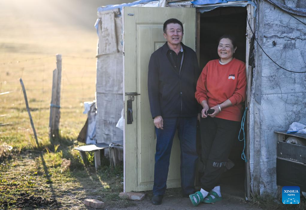 Duurengbulag and his wife are seen at the summer pasture in Baori Hushu Gacha of Gerquluu Sumu, Jarud Banner of Tongliao, north China's Inner Mongolia Autonomous Region, Sept. 19, 2025. Every September, herders in Baori Hushu Gacha of Gerquluu Sumu in Jarud Banner drive their well-fed livestock from the summer pastures back to the winter pasture. (Xinhua/Lian Zhen)