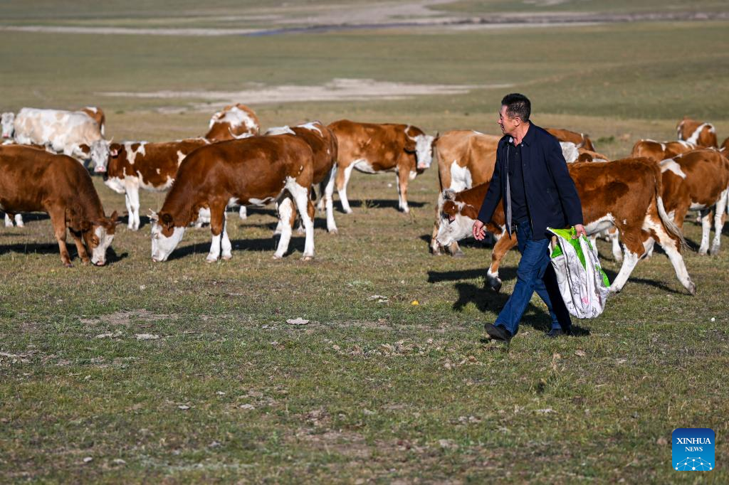 Duurengbulag looks at a neighbor's livestock at the summer pasture in Baori Hushu Gacha of Gerquluu Sumu, Jarud Banner of Tongliao, north China's Inner Mongolia Autonomous Region, Sept. 19, 2025. Every September, herders in Baori Hushu Gacha of Gerquluu Sumu in Jarud Banner drive their well-fed livestock from the summer pastures back to the winter pasture. (Xinhua/Lian Zhen)