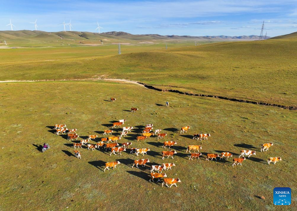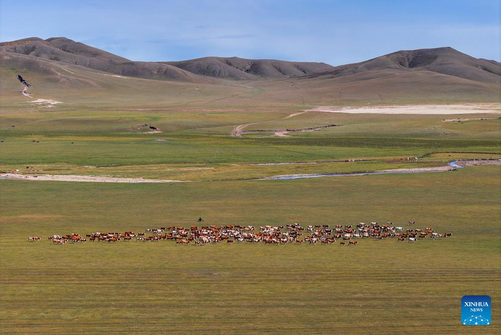 An aerial drone photo taken on Sept. 19, 2025 shows the summer pasture where Duurengbulag's family has stayed in Baori Hushu Gacha of Gerquluu Sumu, Jarud Banner of Tongliao, north China's Inner Mongolia Autonomous Region. Every September, herders in Baori Hushu Gacha of Gerquluu Sumu in Jarud Banner drive their well-fed livestock from the summer pastures back to the winter pasture. (Xinhua/Lian Zhen)