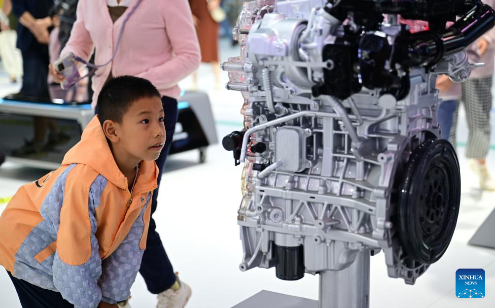A child views an engine displayed at the 2025 World Manufacturing Convention (WMC) in Hefei, east China's Anhui Province, Sept. 20, 2025. Themed "Intelligent Manufacturing For a Better Future", the 2025 WMC kicked off here on Saturday. (Xinhua/Zhou Mu)