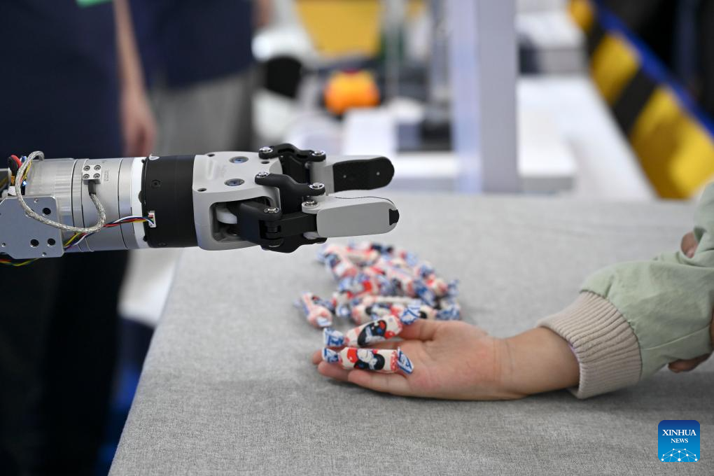 A robot puts candy on a child's hand at the 2025 World Manufacturing Convention (WMC) in Hefei, east China's Anhui Province, Sept. 20, 2025. Themed "Intelligent Manufacturing For a Better Future", the 2025 WMC kicked off here on Saturday. (Xinhua/Huang Bohan)