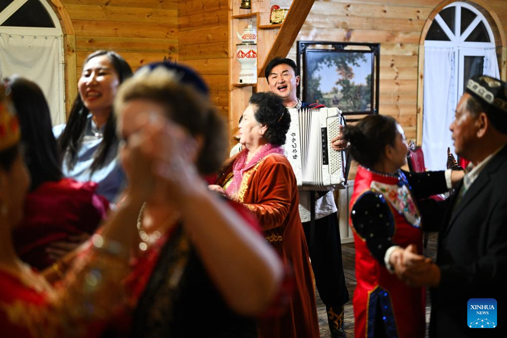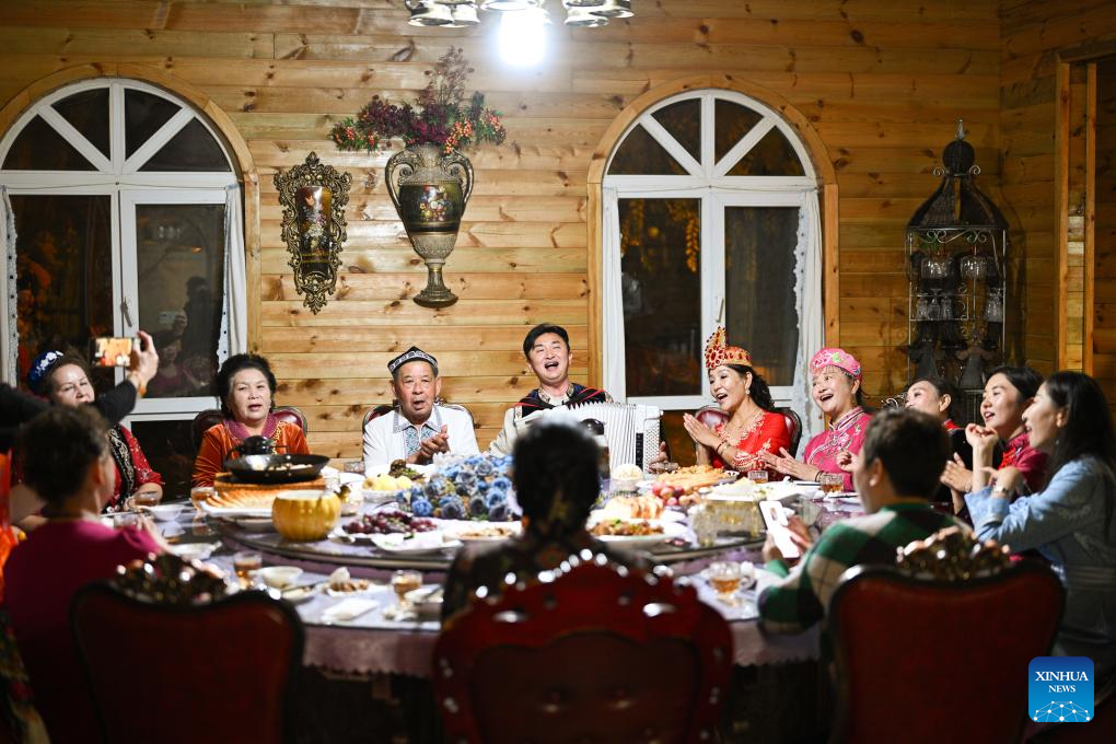 Guests dance after a meal at the agritainment of Ma Xiuhua in Tacheng City, northwest China's Xinjiang Uygur Autonomous Region, Sept. 17, 2025.(Xinhua/Wang Fei)