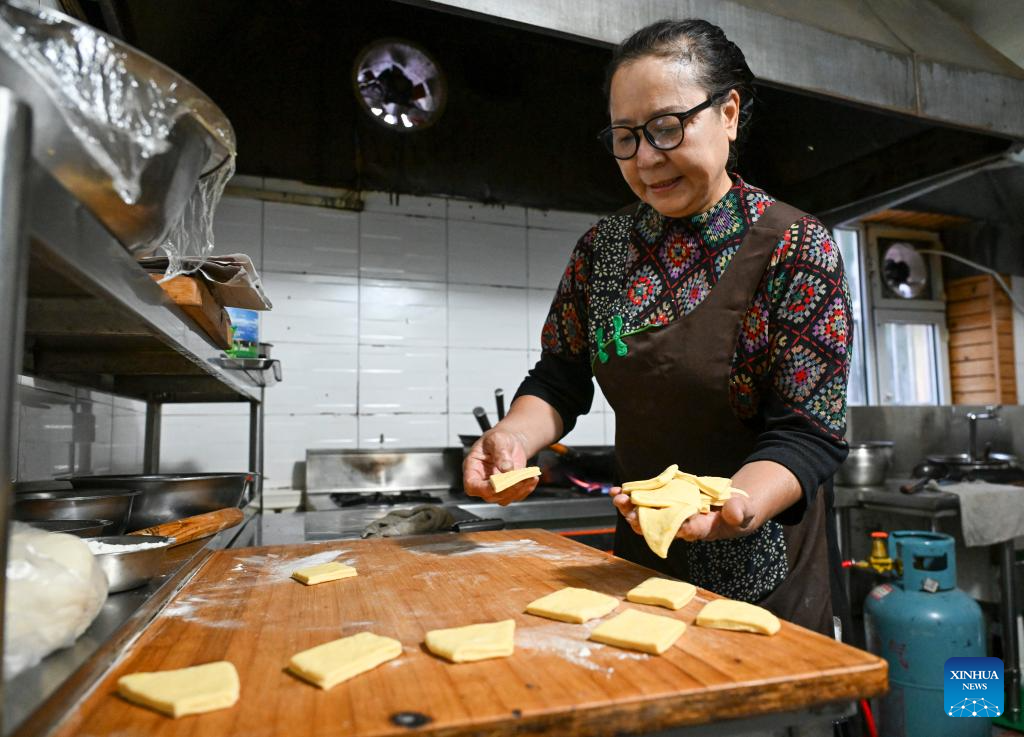 Ma Xiuhua makes a dish of Kazakh ethnic group in Tacheng City, northwest China's Xinjiang Uygur Autonomous Region, Sept. 17, 2025.(Xinhua/Chen Shuo)