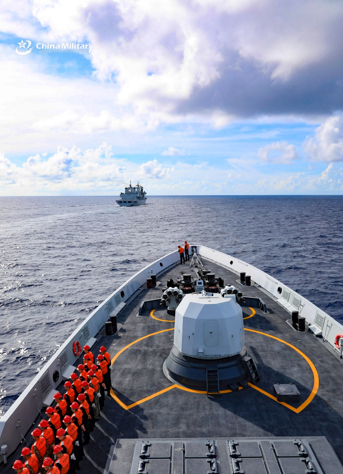 The guided-missile frigate Chenzhou (Hull 552) attached to a flotilla of the Chinese PLA Navy approaches the comprehensive supply ship Honghu (Hull 906) for alongside replenishment-at-sea during a maritime training exercise in late August, 2025. (eng.chinamil.com.cn/Photo by Ge Hanqiang and Wang Chunguang)