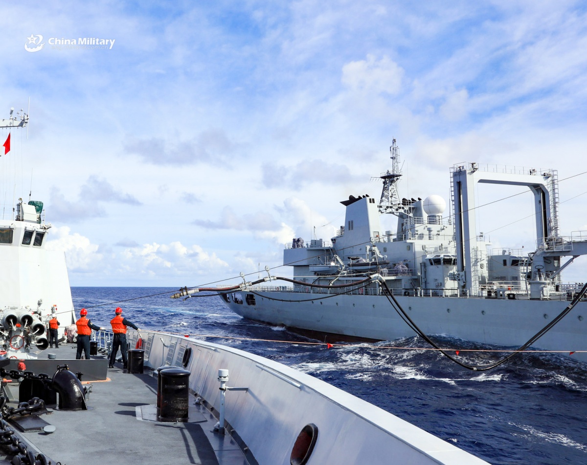 The guided-missile frigate Chenzhou (Hull 552) attached to a flotilla of the Chinese PLA Navy practices alongside replenishment-at-sea with the comprehensive supply ship Honghu (Hull 906) during a maritime training exercise in late August, 2025. (eng.chinamil.com.cn/Photo by Ge Hanqiang and Wang Chunguang)