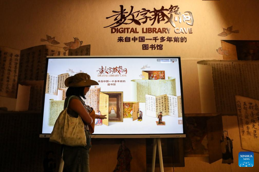 A visitor learns about the protection and restoration of the ancient murals of the Mogao Grottoes at an exhibition held by the Dunhuang Academy during the 8th Silk Road (Dunhuang) International Cultural Expo in Dunhuang, northwest China's Gansu Province, Sept. 22, 2025. More than 1,200 representatives from 97 countries and eight international organizations have gathered at the 8th Silk Road (Dunhuang) International Cultural Expo, which kicked off on Sunday in Dunhuang, a key hub on the ancient Silk Road in northwest China. (Xinhua/Lang Bingbing)