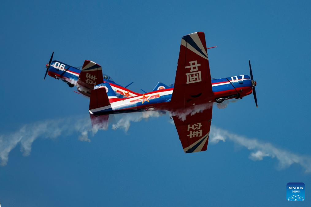 Aircraft of the Tianzhiyi Aerobatic Team perform during the 2025 aviation open-day activities of the Chinese People's Liberation Army Air Force and Changchun Air Show in Changchun, northeast China's Jilin Province, Sept. 23, 2025. The events concluded here on Tuesday. (Photo by Tan Sicheng/Xinhua)