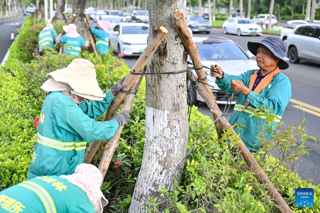 Staff members reinforce trees in Haikou, south China's Hainan Province, Sept. 23, 2025. Typhoon Ragasa is expected to impact the island province of Hainan, with the provincial capital Haikou to suspend classes, ferry services, park operations, work and business activities starting later on Tuesday or Wednesday. All train services to and from the island will be canceled on Wednesday. (Xinhua/Guo Cheng)