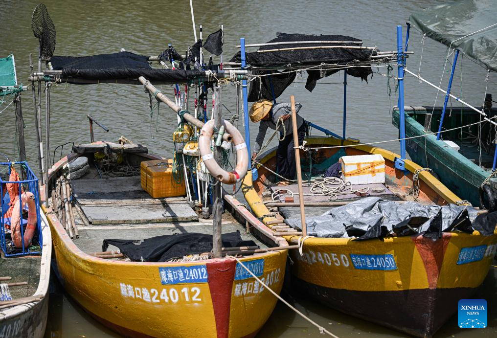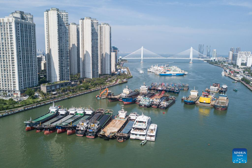 Fishing boats are docked to shelter from the wind in Haikou, south China's Hainan Province, Sept. 23, 2025. Typhoon Ragasa is expected to impact the island province of Hainan, with the provincial capital Haikou to suspend classes, ferry services, park operations, work and business activities starting later on Tuesday or Wednesday. All train services to and from the island will be canceled on Wednesday. (Xinhua/Pu Xiaoxu)