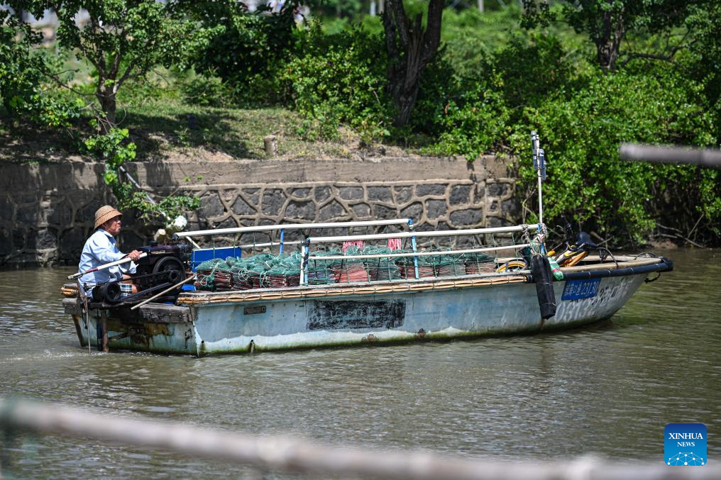 A fisherman sails a fishing boat into a branch of a river to shelter from the wind in Haikou, south China's Hainan Province, Sept. 23, 2025. Typhoon Ragasa is expected to impact the island province of Hainan, with the provincial capital Haikou to suspend classes, ferry services, park operations, work and business activities starting later on Tuesday or Wednesday. All train services to and from the island will be canceled on Wednesday. (Xinhua/Pu Xiaoxu)