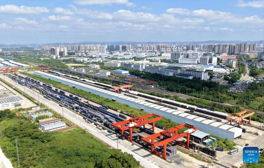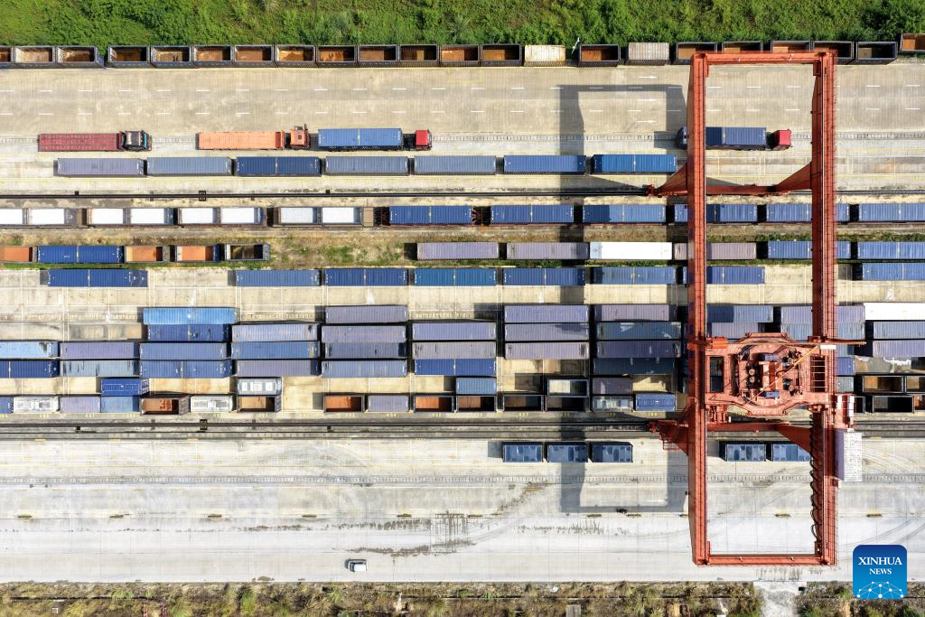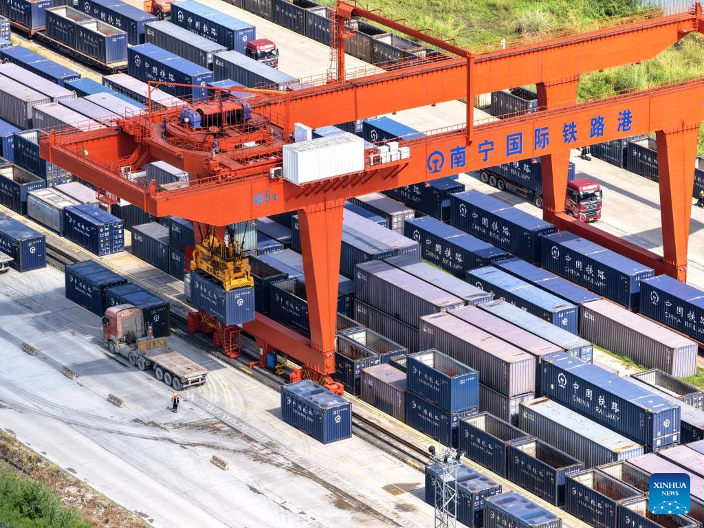 An aerial drone photo taken on Sept. 23, 2025 shows the Nanning International Railway Port in Nanning, south China's Guangxi Zhuang Autonomous Region. As of Sept. 22, freight trains departing from Guangxi heading to Vietnam have transported a total of 26,000 TEUs (twenty-foot equivalent units) of export goods, marking a year-on-year surge of 173 percent, according to the China Railway Nanning Group Co., Ltd. (Xinhua/Xing Guangli)