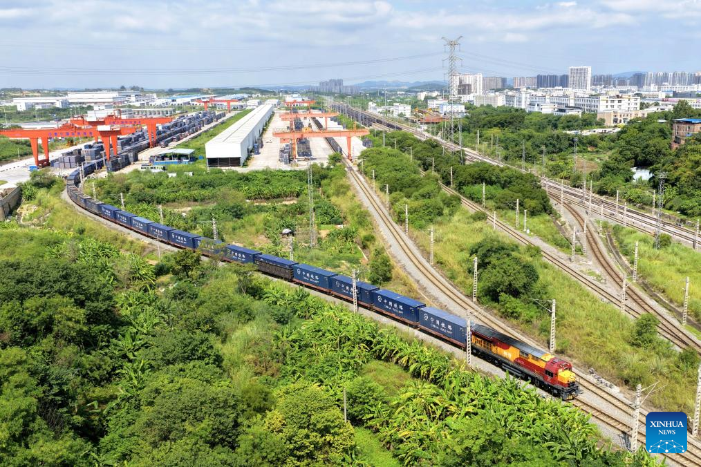 An aerial drone photo taken on Sept. 23, 2025 shows a China-Vietnam freight train pulling out of the Nanning International Railway Port in Nanning, south China's Guangxi Zhuang Autonomous Region. As of Sept. 22, freight trains departing from Guangxi heading to Vietnam have transported a total of 26,000 TEUs (twenty-foot equivalent units) of export goods, marking a year-on-year surge of 173 percent, according to the China Railway Nanning Group Co., Ltd. (Xinhua/Xing Guangli)