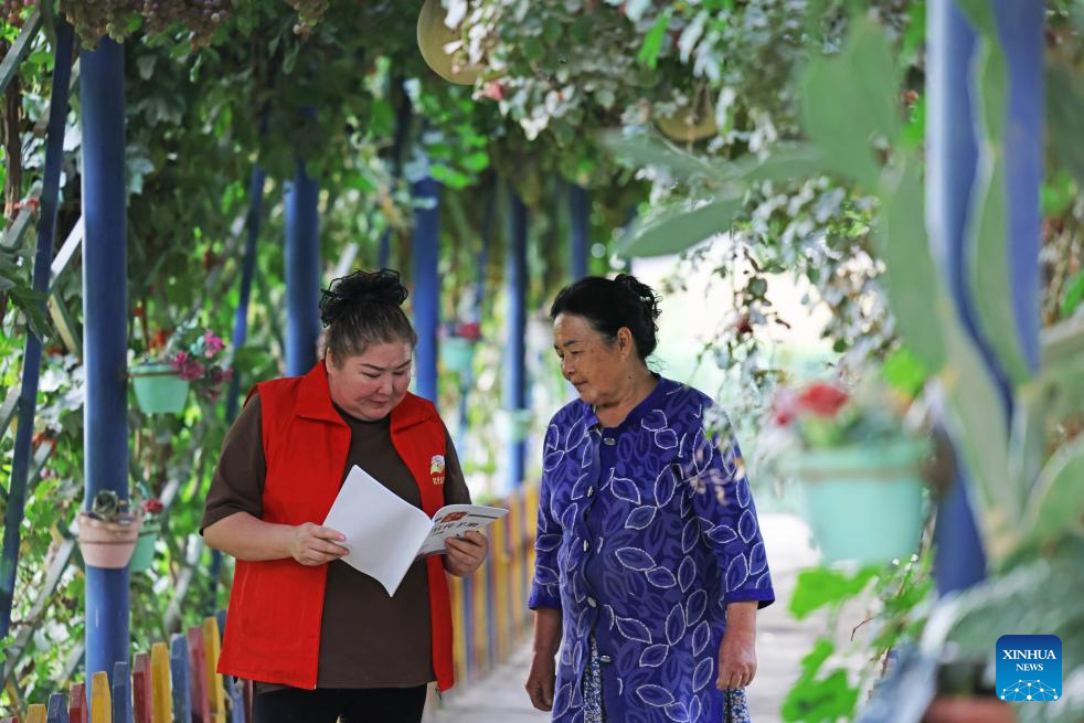 A village cadre (L) introduce beneficial policies to a villager at her house in Daxi Village of Yuli County, Mongolian Autonomous Prefecture of Bayingolin, northwest China's Xinjiang Uygur Autonomous Region, Sept. 18, 2025. People in Daxi Village of Yuli County used to live a poor life due to the harsh natural environment and limited means of living. In recent years, local authorities have made efforts to develop tourism and e-commerce to promote rural development, which has brought more income for local villagers. (Xinhua/Lu Ye)
