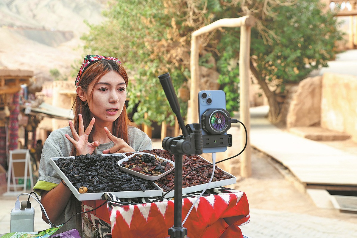 A vendor livestreams to promote her products at Tuyugou Cultural Tourism Town. WANG ZIRU/CHINA NEWS SERVICE