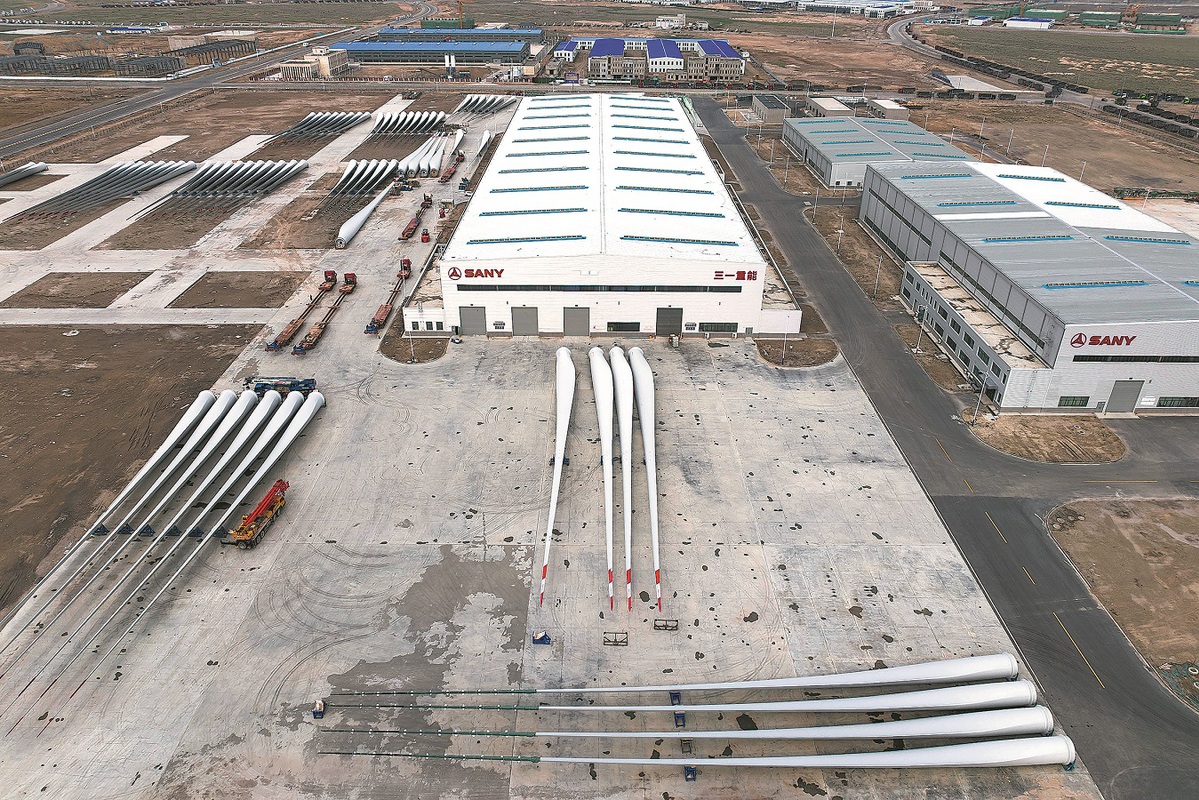 Turbine blades, each measuring 121 meters long and weighing 40 metric tons, are stored at the plant. [Photo provided to China Daily]