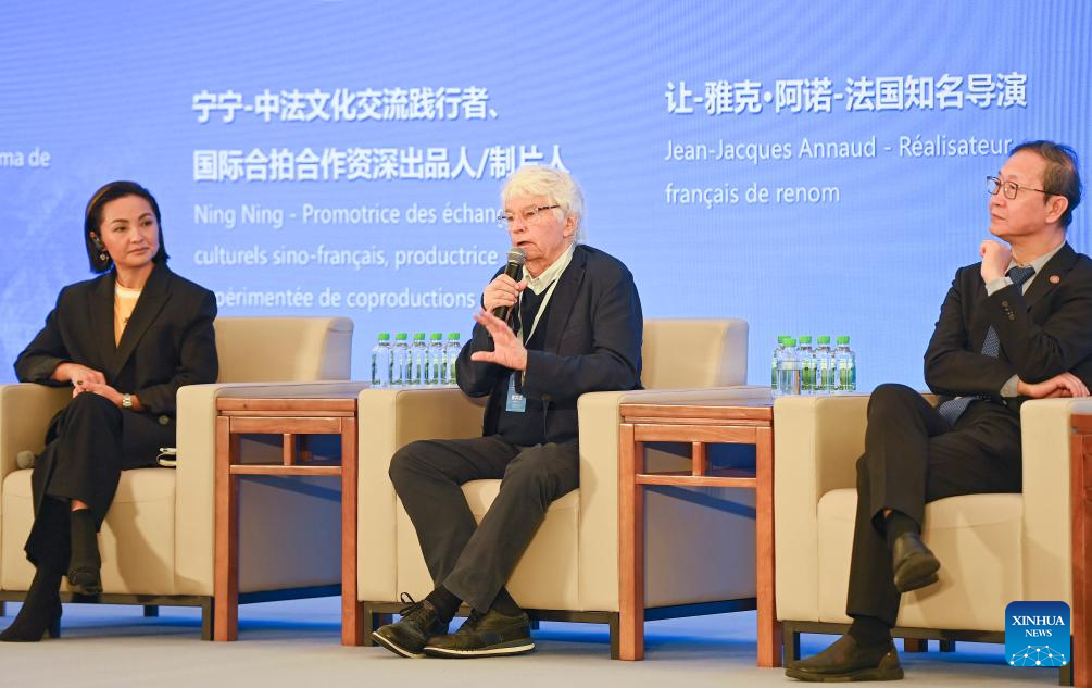 French director Jean-Jacques Annaud (C) speaks during the "Sino-French Audiovisual Dialogue Salon" of the "Wind in Motion: Sino-French Audiovisual Dialogue" series events held as part of the Beijing Culture Forum in Beijing, capital of China, Sept. 24, 2025. (Xinhua/Xiao Xiao)