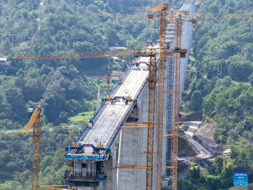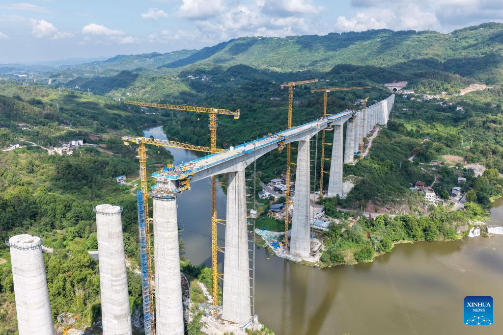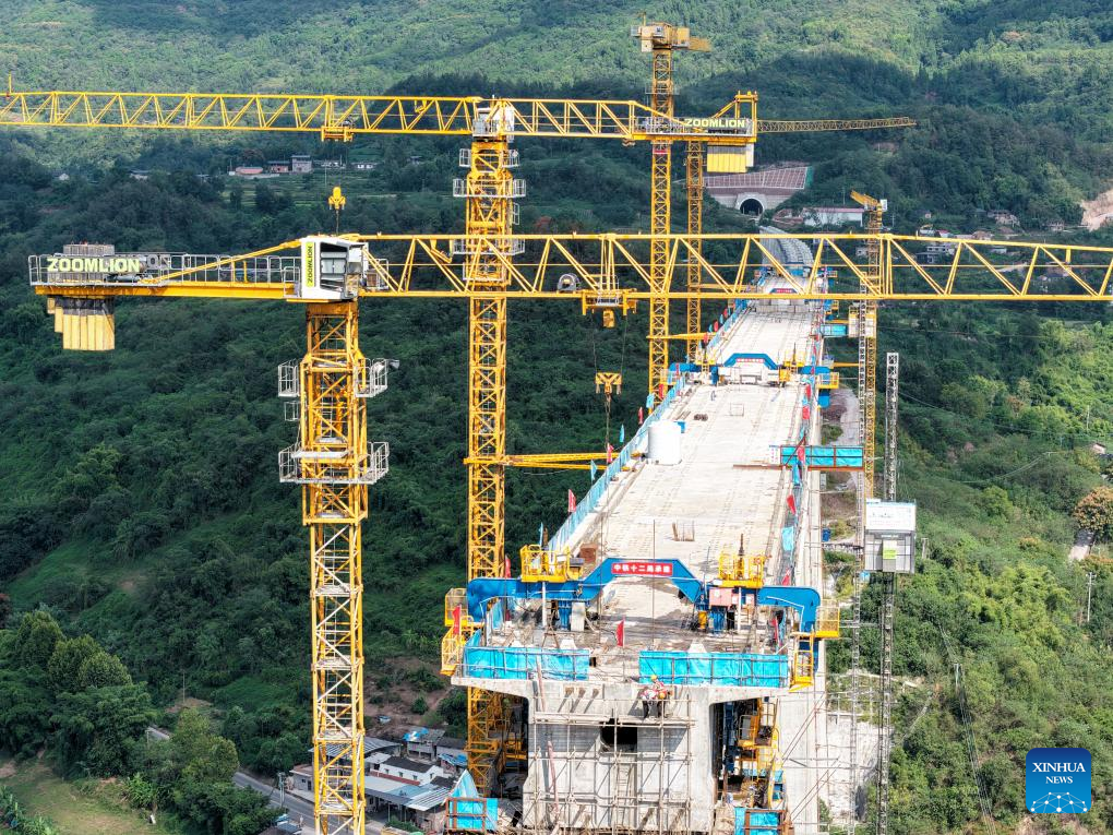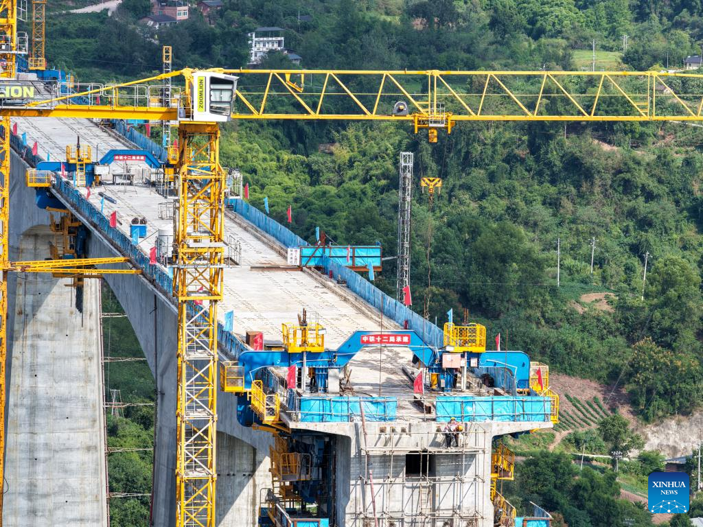 Workers work at the construction site of a double-track grand bridge along the Chongqing-Wanzhou high-speed railway over the Wubu River in southwest China's Chongqing Municipality, Sept. 24, 2025. Contracted by China Railway 12th Bureau Group Co., Ltd., the main span of the grand bridge finished its closure on Wednesday, laying a foundation for the opening of the whole line on schedule. (Xinhua/Tang Yi)
