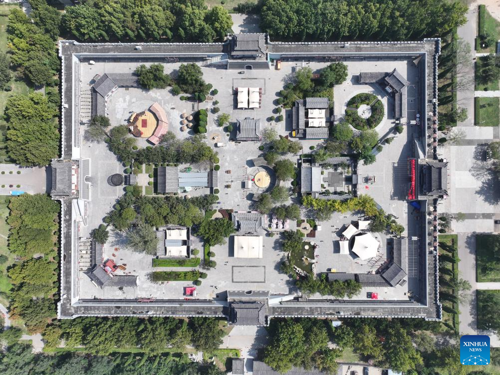 An aerial drone photo shows a view of Wuqiao Acrobatics World in Wuqiao County of Cangzhou, north China's Hebei Province, Sept. 25, 2025. Wuqiao Acrobatics World, an acrobatics themed park, is a bustling folklore attraction and multi-functional complex combining services including entertainment, cultural experiences, exhibitions, training, competitions and cultural exchanges. (Xinhua/Mu Yu)