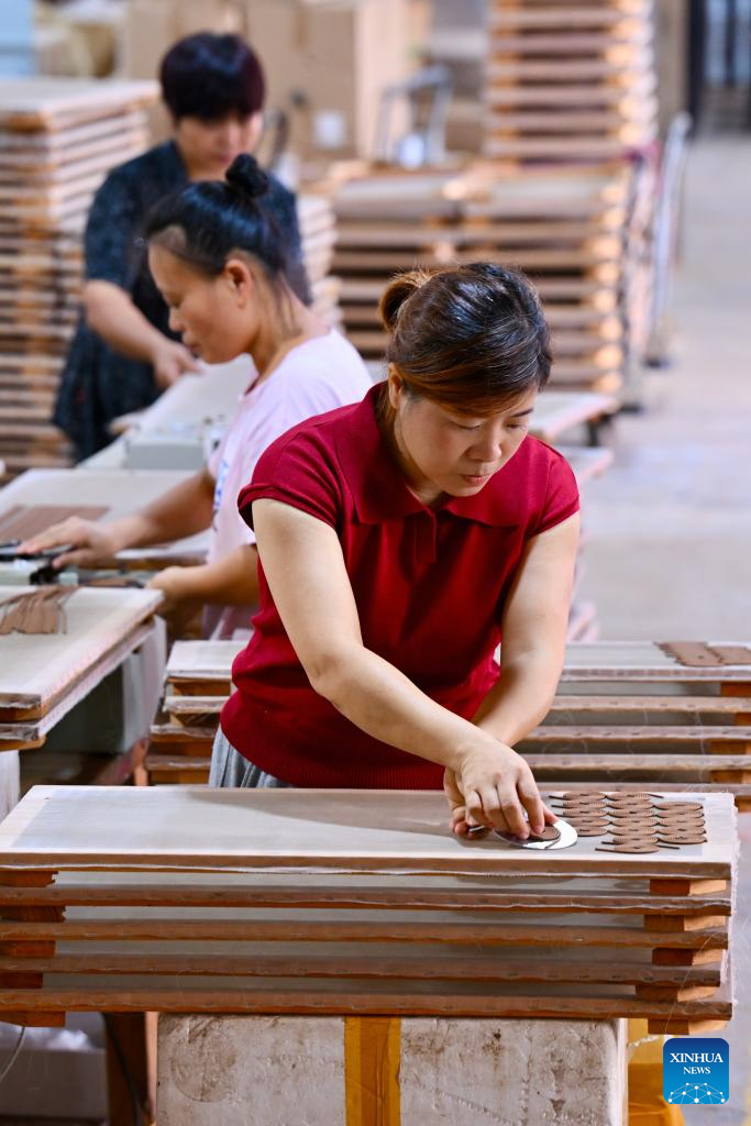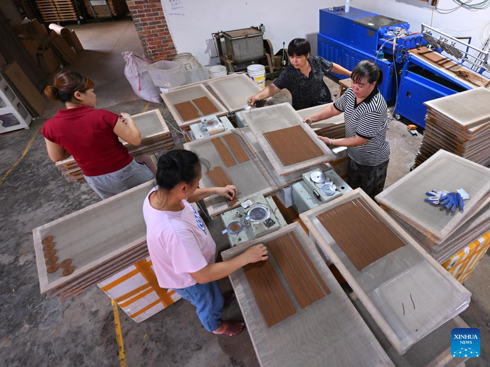 Staff members of an incense-making enterprise make incense sticks in Laidian Town, Xianyou County of southeast China's Fujian Province, on Sept. 24, 2025. Xianyou County is a significant trading and distribution center for agarwood and sandalwood in China. In recent years, the county has been working on the development of its incense-related business by leveraging the abundance in raw materials, a mature incense-making industrial chain, and online and offline sales networks there. (Xinhua/Jiang Kehong)