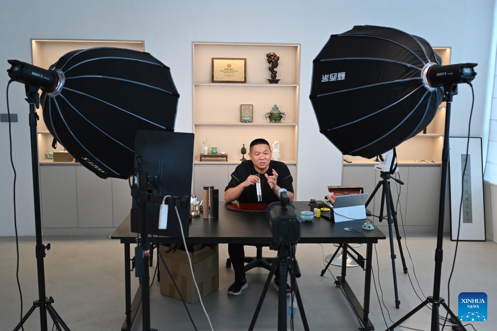 A manager of an incense-making enterprise introduces natural incense products during a live streaming session in Xianyou County, southeast China's Fujian Province, on Sept. 24, 2025. Xianyou County is a significant trading and distribution center for agarwood and sandalwood in China. In recent years, the county has been working on the development of its incense-related business by leveraging the abundance in raw materials, a mature incense-making industrial chain, and online and offline sales networks there. (Xinhua/Jiang Kehong)
