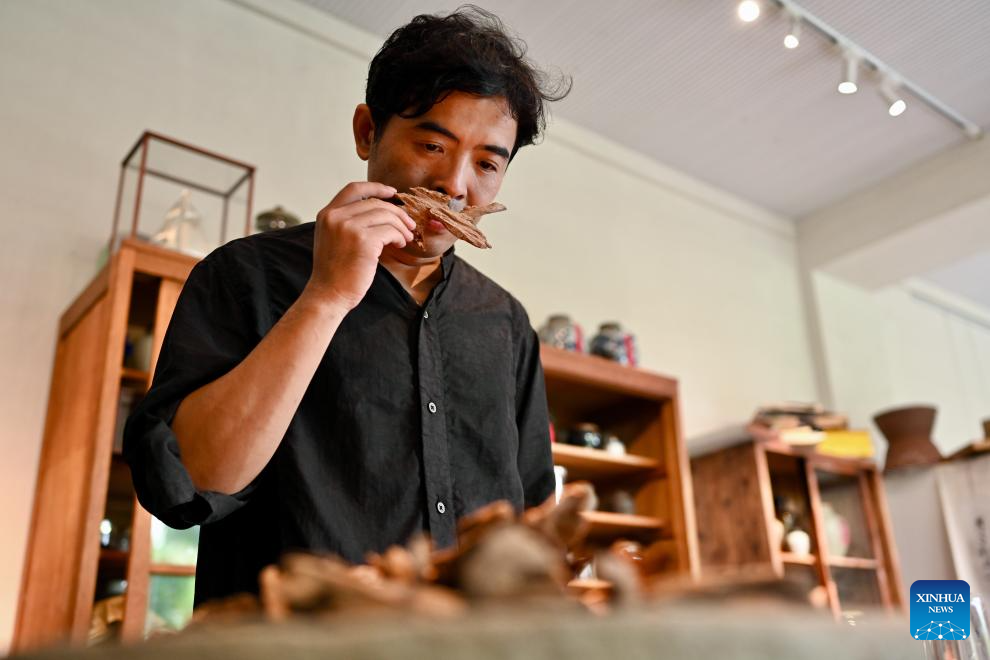 Chen Bin, an incense-making artisan, selects agarwood raw material for production of natural incense in Xianyou County, southeast China's Fujian Province, on Sept. 24, 2025. Xianyou County is a significant trading and distribution center for agarwood and sandalwood in China. In recent years, the county has been working on the development of its incense-related business by leveraging the abundance in raw materials, a mature incense-making industrial chain, and online and offline sales networks there. (Xinhua/Jiang Kehong)