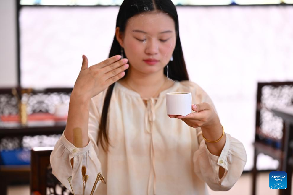 A staff member demonstrates the proper move of smelling incense at an agarwood museum in Xianyou County, southeast China's Fujian Province, on Sept. 24, 2025. Xianyou County is a significant trading and distribution center for agarwood and sandalwood in China. In recent years, the county has been working on the development of its incense-related business by leveraging the abundance in raw materials, a mature incense-making industrial chain, and online and offline sales networks there. (Xinhua/Jiang Kehong)