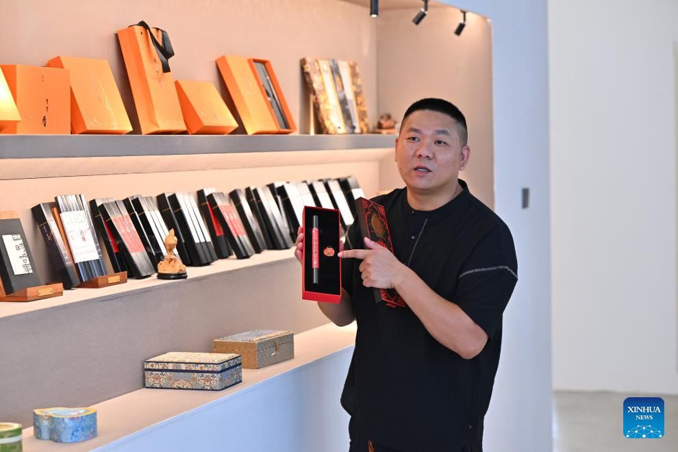 The person in charge of an incense-making enterprise introduces cultural and creative products of natural incense in Xianyou County, southeast China's Fujian Province, on Sept. 24, 2025. Xianyou County is a significant trading and distribution center for agarwood and sandalwood in China. In recent years, the county has been working on the development of its incense-related business by leveraging the abundance in raw materials, a mature incense-making industrial chain, and online and offline sales networks there. (Xinhua/Jiang Kehong)