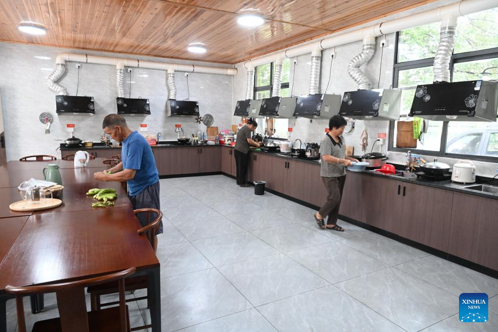 Senior citizens use a shared kitchen to cook at a community elderly care center in Shitun Town of Zhenghe County, Nanping City, southeast China's Fujian Province, Sept. 24, 2025. Zhenghe County in Fujian Province has been actively building a comprehensive elderly care system, exploring the construction of community elderly care centers in villages and towns, which are transformed from idle primary schools, old nursing homes and other idle resources and have promoted elderly care in remote rural areas. (Xinhua/Lin Shanchuan)