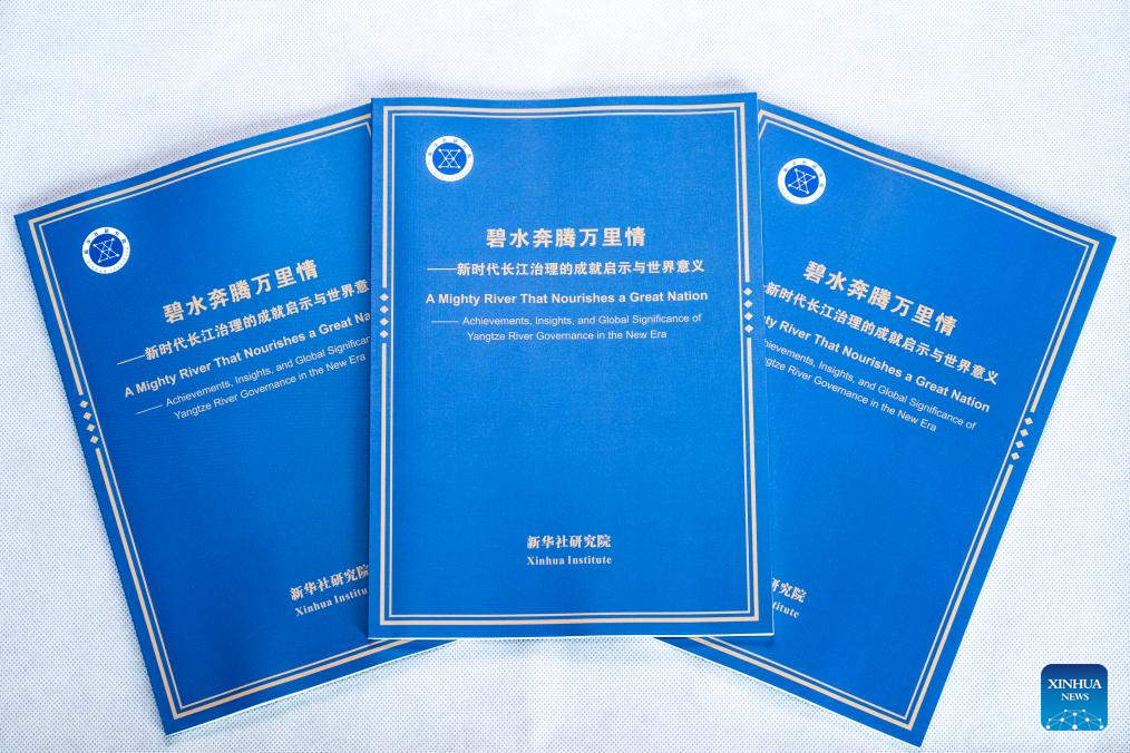 This photo shows copies of the think tank report "A Mighty River That Nourishes a Great Nation -- Achievements, Insights, and Global Significance of Yangtze River Governance in the New Era." The report was released Friday by Xinhua Institute, a think tank affiliated with Xinhua News Agency, at the ongoing 2025 Great Rivers Forum in Wuhan, central China's Hubei Province. (Xinhua/Wu Zhizun)