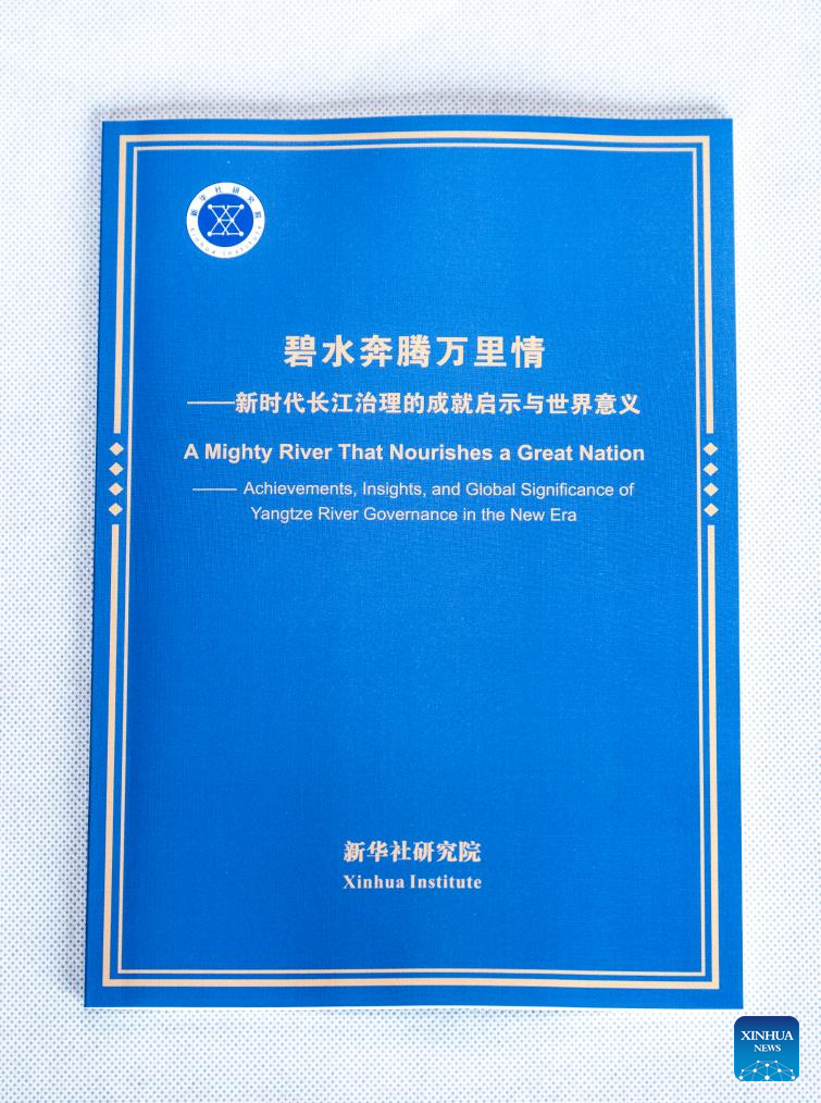 This photo shows a copy of the think tank report "A Mighty River That Nourishes a Great Nation -- Achievements, Insights, and Global Significance of Yangtze River Governance in the New Era." The report was released Friday by Xinhua Institute, a think tank affiliated with Xinhua News Agency, at the ongoing 2025 Great Rivers Forum in Wuhan, central China's Hubei Province. (Xinhua/Wu Zhizun)