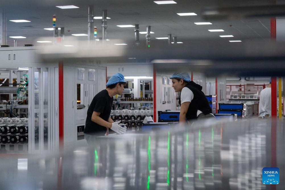 Staff members work on the production line of photovoltaic panels at the workshop of a new energy company in Ruoqiang County, Mongolian Autonomous Prefecture of Bayingolin, northwest China's Xinjiang Uygur Autonomous Region, Sept. 22, 2025. (Xinhua/Jiang Wenyao)