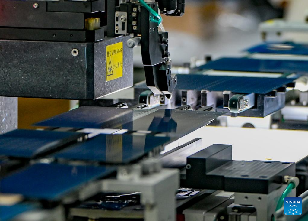 This photo taken on Sept. 22, 2025 shows an automatic machine cutting photovoltaic panels at the workshop of a new energy company in Ruoqiang County, Mongolian Autonomous Prefecture of Bayingolin, northwest China's Xinjiang Uygur Autonomous Region. (Xinhua/Chen Shuo)